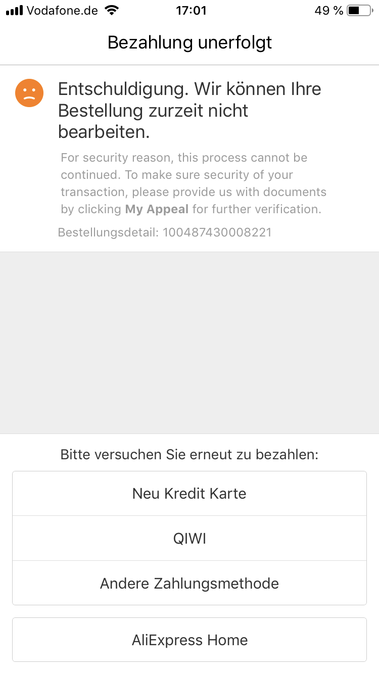 Bezahlung bei Aliexpress fehlgeschlagen